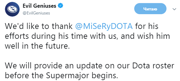 Вскоре после окончания ESL One Birmingham 2018 Расмус «MISERY» Филипсен сообщил в твиттере, что его исключили из состава Evil Geniuses.
