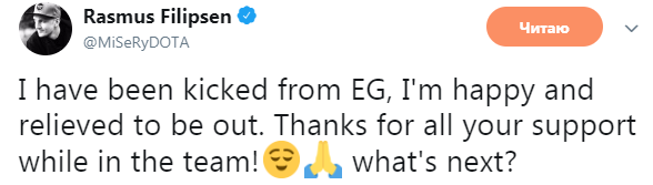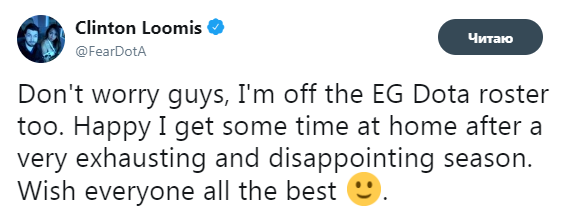 Не беспокойтесь, ребята, я теперь тоже не в составе EG. Счастлив, что отправлюсь домой и отдохну после тяжелого и разочаровывающего сезона. Желаю всего наилучшего.