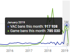 Основная причина увеличения VAC-банов и игровых блокировок - CS:GO, которая бесплатной в начале декабря. Также PUBG Corp. активно занялась массовыми блокировками читеров. Так, за последнюю неделю января 2019 года было забанено около 111 тысяч аккаунтов.