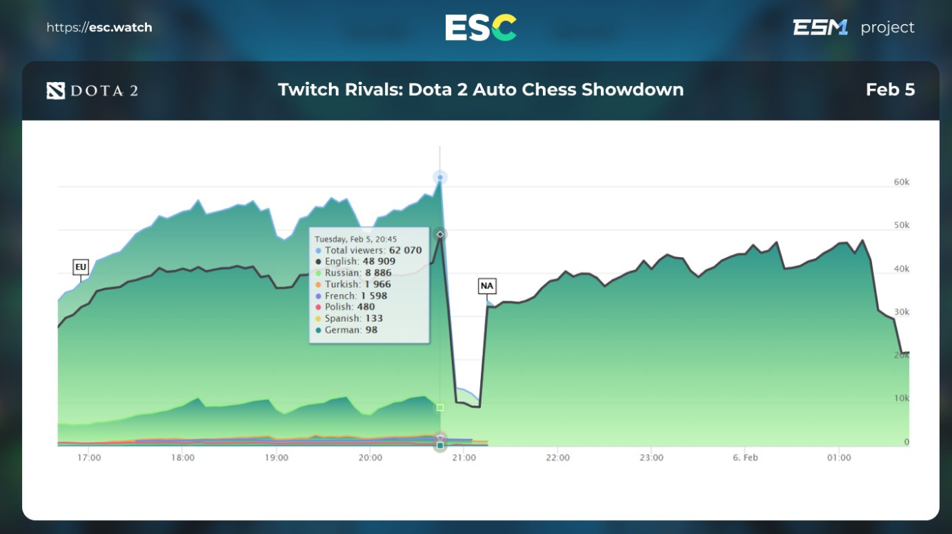 5-6 февраля проходил турнир по Dota Auto Chess в рамках Twitch Rivals. Трансляция европейского региона собрала в пике чуть более 62 тысяч зрителей. 11,7 тыс. среди них из СНГ.