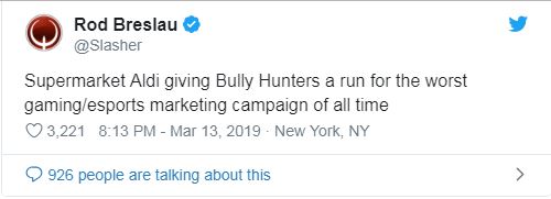 Род Бреслау: "Супермаркет Aldi дает возможность Задирам участвовать в худшей игровой/киберспортивной маркетинговой кампании всех времен" (прим.пер.)