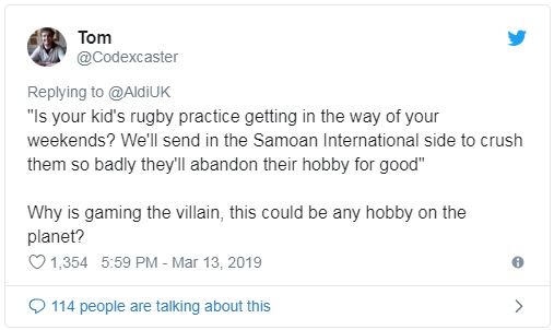Том: "«Тренировка вашего ребенка по регби мешает вашим выходным? Мы отправим команду сборной Самоа по регби и разобьем их так сильно, что они навсегда откажутся от своего хобби.» Почему если игры, то это обязательно зло? Так можно сказать о любом хобби на планете." (прим.пер.)