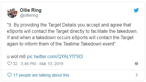 Олли Ринг: "«9. Предоставляя данные Цели, вы принимаете и соглашаетесь с тем, что Киберспортсмен свяжется с Целью напрямую, чтобы облегчить избиение. Если и когда произойдет избиение, Киберспортмен снова свяжется с Целью, чтобы проинформировать его о событии Teatime Takedown».