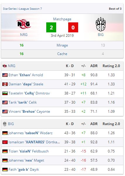 В первой игре серии на Mirage NRG выиграла BiG 16:13, а вот вторая закончилась тотальным разгромом на Cache со счетом 16:4.