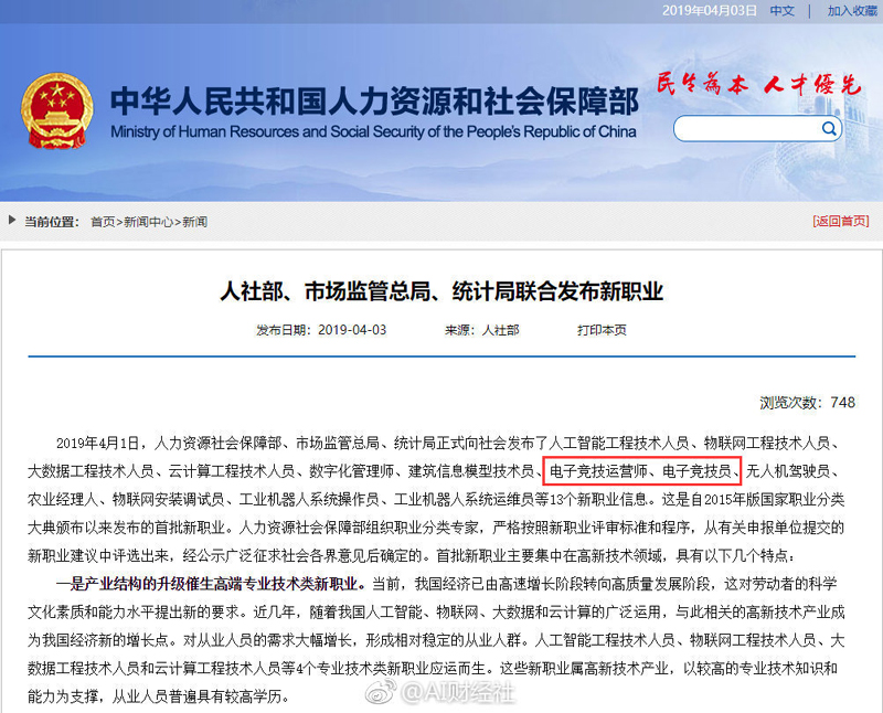 6 февраля министерство людских ресурсов и социального обеспечения Китая (CMHRSS) объявило, что признает 15 новых профессий, в том числе две, связанные с киберспортом: "оператор киберспорта" и "профессионал киберспорта".