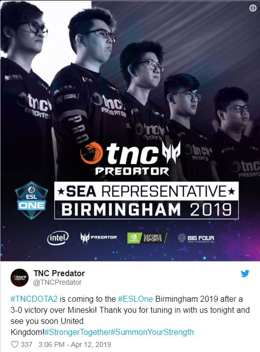 В грандфинале Mineski уже готова была дать им достойный матч-реванш и отыграться за поражение в начале недели. Но TNC еще раз показала превосходство над Mineski, одержав быструю и простую победу со счетом 3:0, гарантировав себе место на ESL One Birmingham 2019.