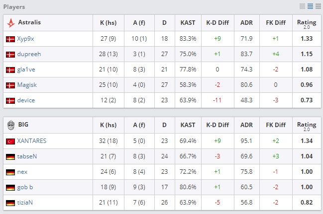 В противостоянии против Astralis больше всего убийств совершил Кан "XANTARES" Дурткардес - 32. Его Rating 2.0 составил 1.34, это наивысший показатель в этой встрече.