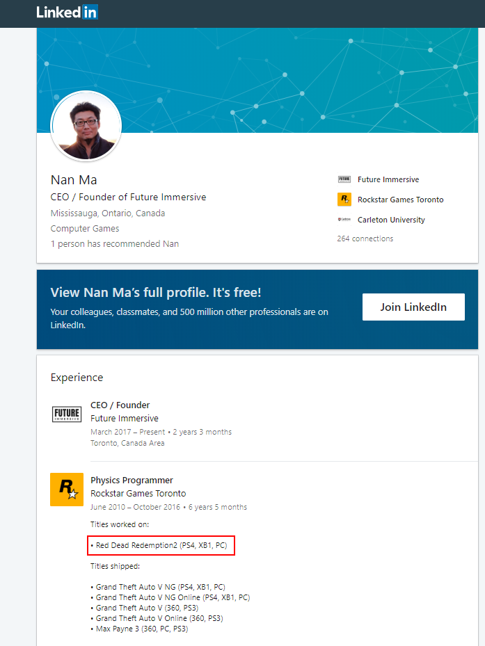 Пользователь Reddit сделал скриншот страницы в Linkedin бывшего программиста физики в Rockstar Games Toronto, который проработал в компании больше шести лет: с июня 2010 по октябрь 2016 года. Его профиль говорит о том, что он трудился над RDR2 для PlayStation 4, Xbox One и PC.